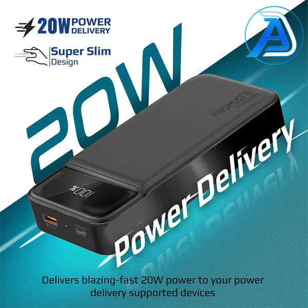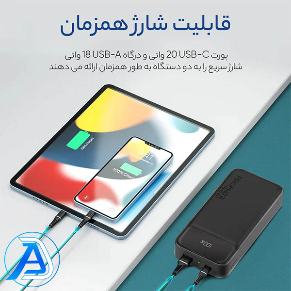 باتری لیتیوم پلیمر ۲۰۰۰۰ میلآمپر ساعت که دستگاههای کاربر را شارژ نگه میدارد. شارژ سریع و همزمان دو دستگاه با دو پورت USB-C و USB-A/ تا هفت برابر سریعتر از شارژ معمولی فناوری شارژ دینامیک، برای ایجاد شارژ ایمن و بهینه خروجی ۲۰ وات از پورت USB-C با فناوری شارژ سریع Power Delivery خروجی ۱۸ وات از پورت USB-A با فناوری شارژ سریع Quick Charge ۳.۰ طراحی فوق باریک/ LED هوشمند برای نمایش ظرفیت پاوربانک